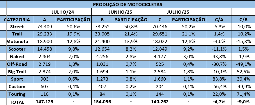 Com 50,9% do volume total fabricado, a Street foi a categoria mais produzida no acumulado do ano. A Trail ficou em segundo lugar, com 20,9% da produção, seguida pela Motoneta com 13,6%.